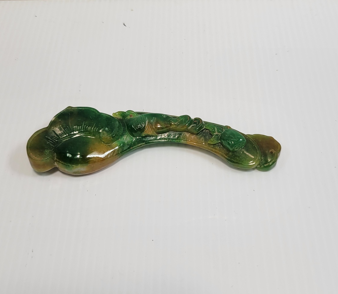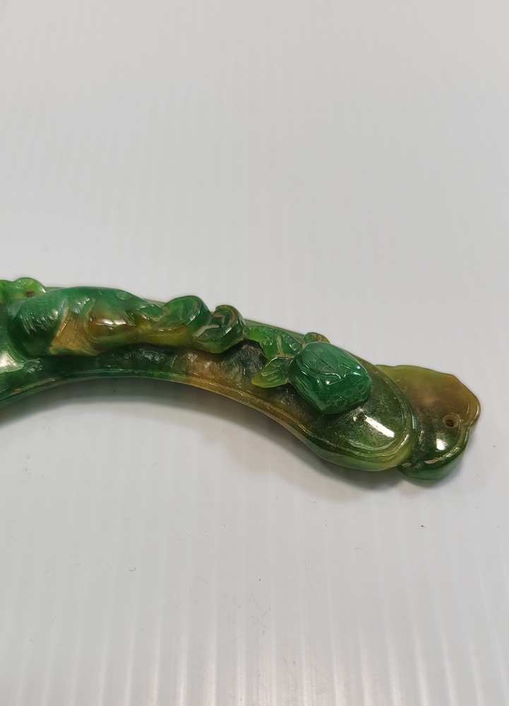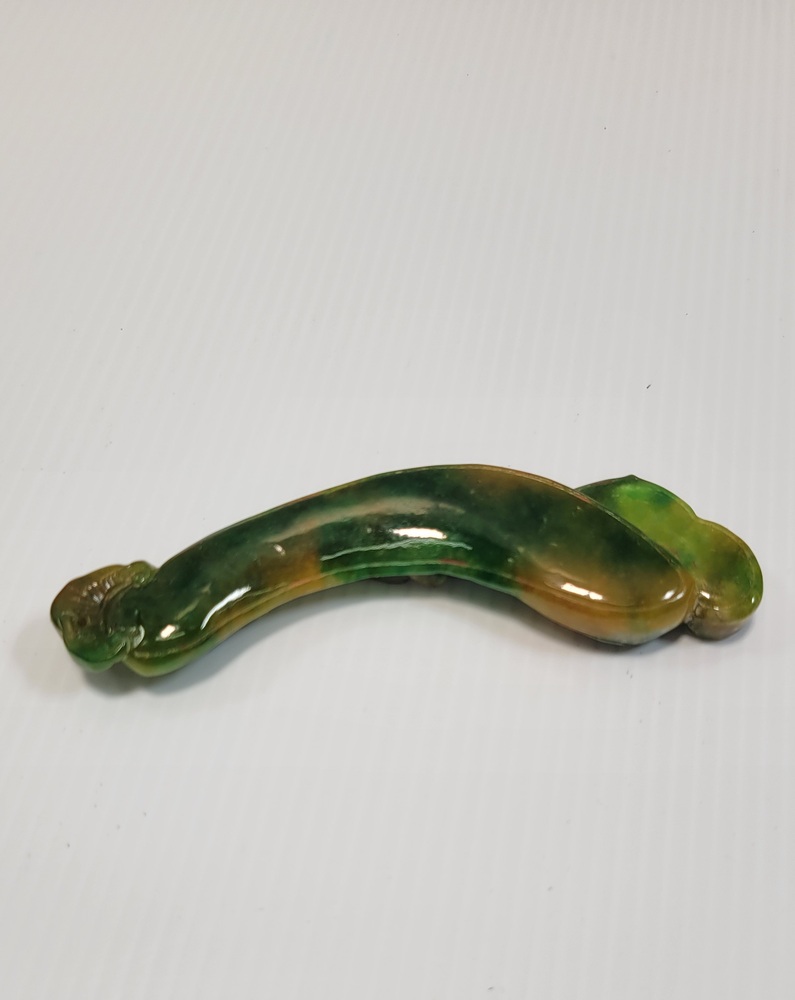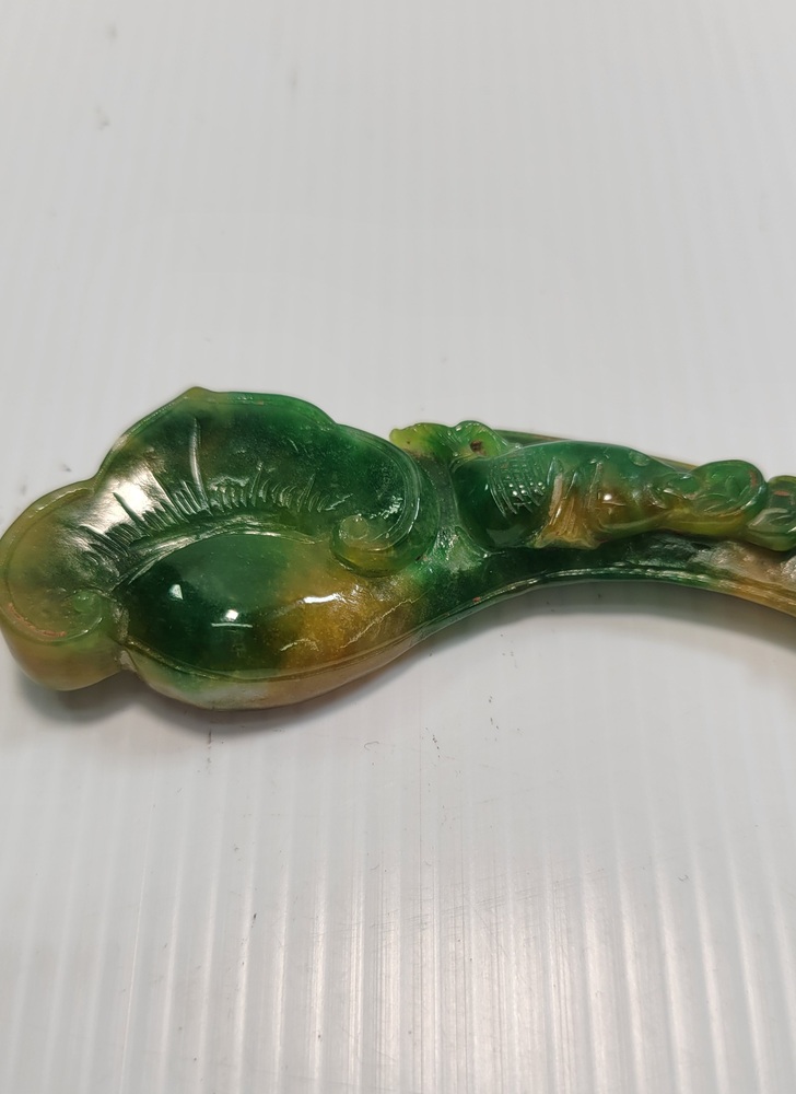 Carved Jade, which is known for its variations in color, and this piece shows a mix of green and yellow hues.