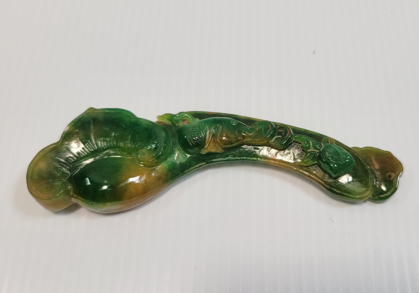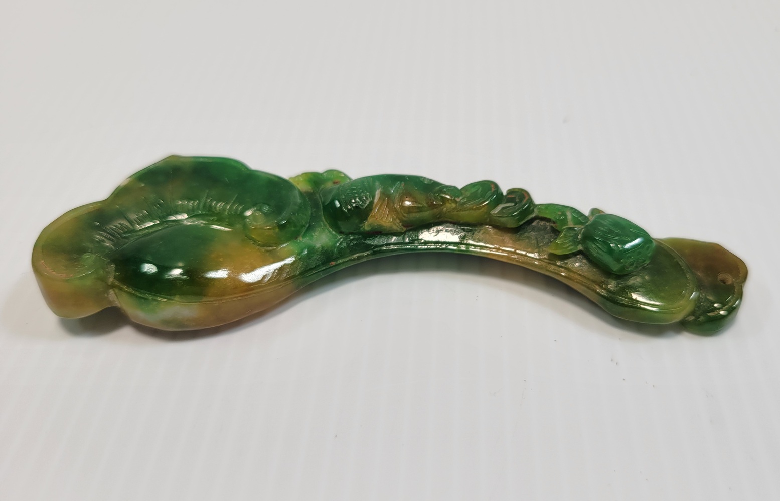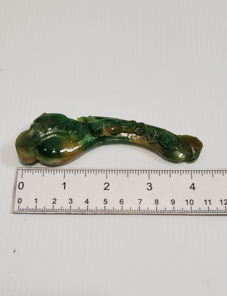 Carved Jade, which is known for its variations in color, and this piece shows a mix of green and yellow hues.