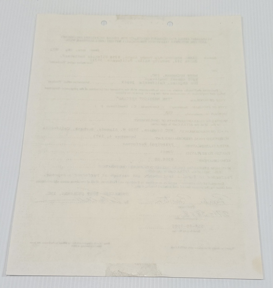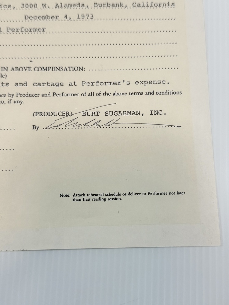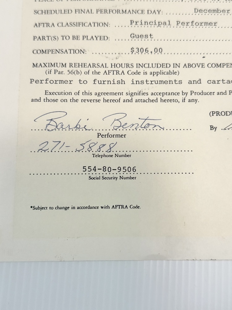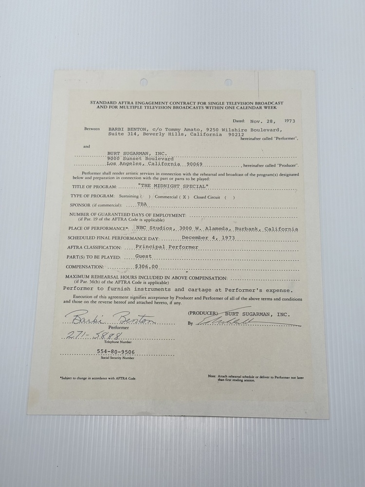 Signed Contract For "The Midnight Special" Between Barbi Benton & Burt Sugarman